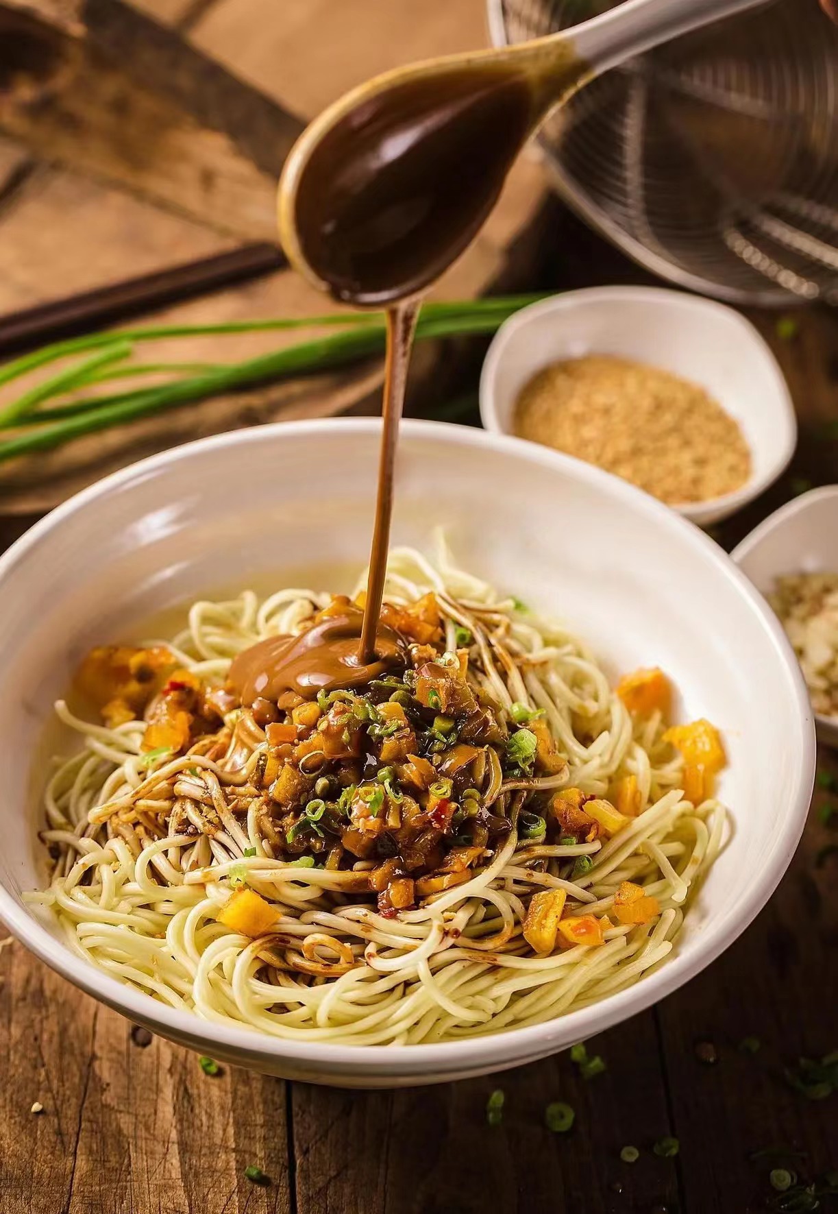 说到热干面,人们自然而然地就想起武汉,不得不说热干面早已是武汉的一张城市名片了,它是武汉最具代表性的名小吃,人们来到武汉旅游,不尝一尝热干面,总感觉是白来了一趟,每个武汉人的早餐都是从一碗香喷喷的武汉热干面开始的。面馆师傅手抓二两面条,放在沸腾的开水里,用长勺在开水里抖动七八下,捞出,稍沥干,然后倒入碗里,浇上卤水,依次加入酸豆角、胡萝卜丁、葱花,香菜等十多种调料,最后淋上一勺香浓的芝麻酱,一碗美味的热干面就做成了,如果再配上一个刚炸好的热面窝,一碗三鲜豆皮,或一碗豆浆,就是一个完美的“豪华早套餐”了,吃完这样的豪华套餐,一天都能量满满,干劲十足。