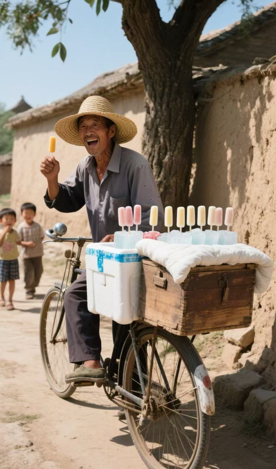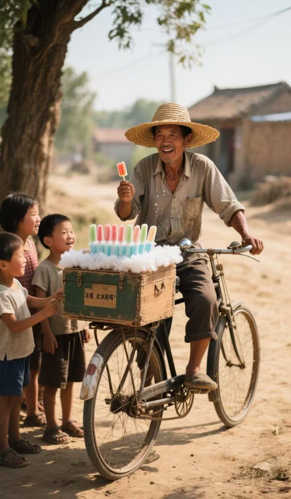 那时的村庄,在烈日的炙烤下,连空气都变得粘稠。古树耷拉着叶子,蔫头耷脑地蜷在天地间,连一丝风都不肯施舍。唯有卖冰棍的吆喝声,能让整个村子突然活过来。“冰棍,卖冰棍咯!要买冰棍快来呀!”声音穿过热浪,撞在土墙根上又弹起来,在每一个孩子的耳朵里嗡嗡作响。卖冰棍的人总戴着一顶边缘卷边的旧草帽,草帽下是被晒得黝黑的脸庞,汗珠顺着皱纹的沟壑不断滚落。他骑着吱呀作响的自行车,后架上驮着神秘的箱子——有的裹着泡沫,有的是古朴的木头箱,箱盖上还蒙着厚厚的白色棉被,仿佛藏着全村的清凉。那棉被边角已经磨得发灰,却依旧尽职地守护着箱内的冰凉。