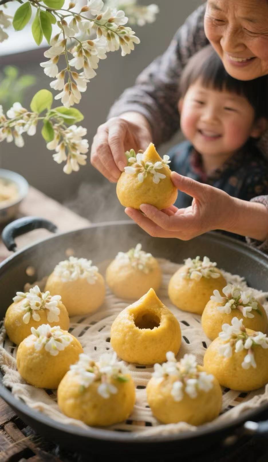 鲜嫩的槐花有好多种吃法,槐花窝头是我家饭桌上必不可少的美食。娘把我们采来的槐花择净洗净,放进面盆,再加入玉米面,多次少量加水和面,把面团和得柔软后,抓起一把在手里转动,团成圆圆的形状。然后,右手拖着面团,左手大拇指顶在面团底部,其余四根手指和右手继续转动,底部转出一个圆圆的洞,上面留个尖尖,再把窝头放在篦子的蒸布上。全部团完后,盖上锅盖,大火蒸十五分钟,再焖五分钟,这时满屋都是淡淡的槐花香,沁人心脾。娘掀开锅盖,黄橙橙的窝头上点缀着雪白的槐花,好看极了。窝头刚出锅,我就迫不及待地去拿,烫得小手赶紧缩回来,娘笑着骂我是小馋猫。